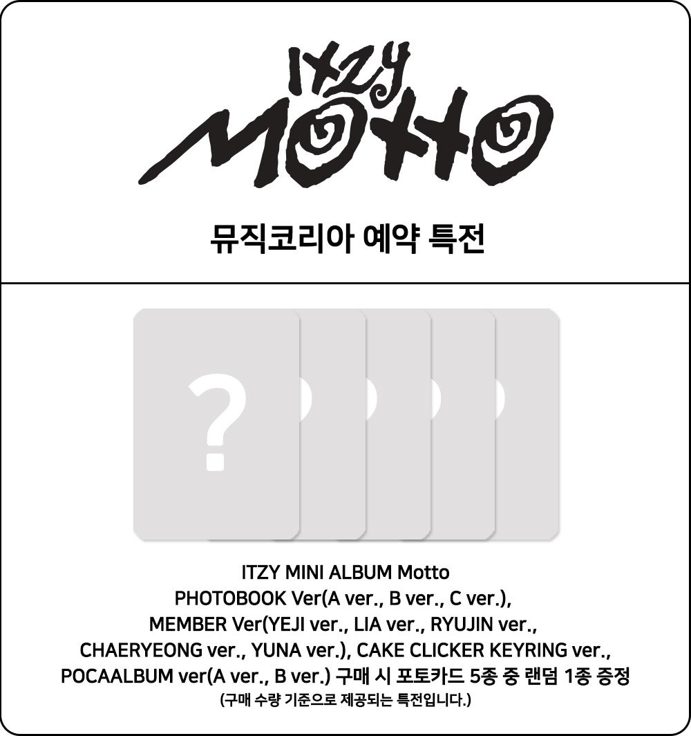 ITZY - MOTTO (MEMBER VER.) + POB APPLE MUSIC está disponible en pre-order en cinco versiones de miembro distintas, cada una con su contenido a juego y su beneficio de pre-order incluido.
