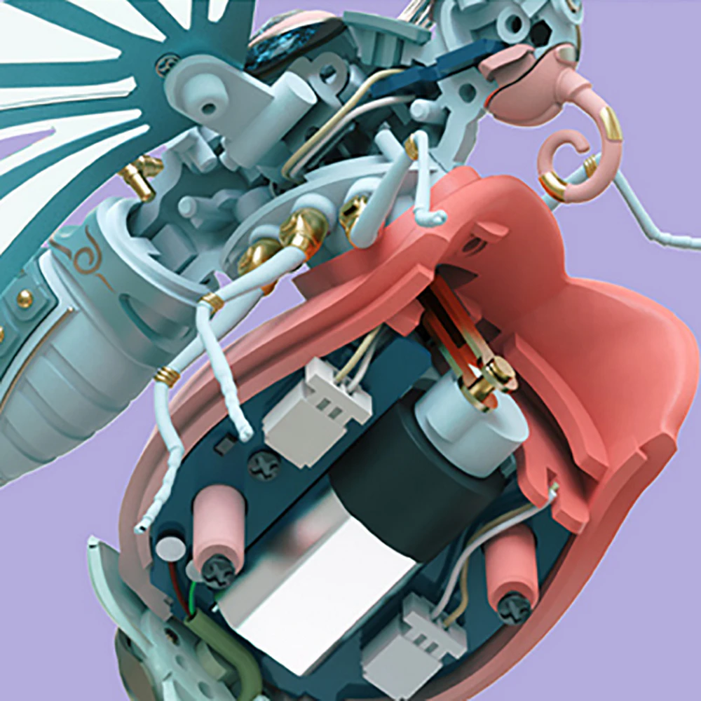 - Mecanismo: Sistema de engranajes manual que activa el batir de las alas.