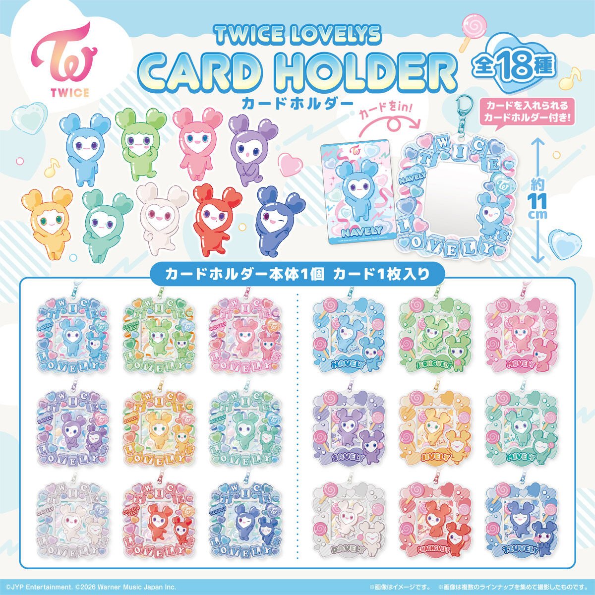 TWICE LOVELYS CARD HOLDER es el set coleccionable de Bandai Shokugan dedicado al grupo de K-POP TWICE, con 18 variantes de tarjetero y tarjeta coleccionable. Incluye un caramelo de limón.